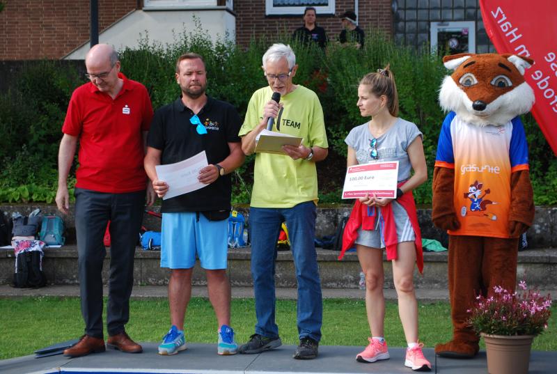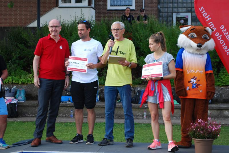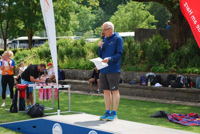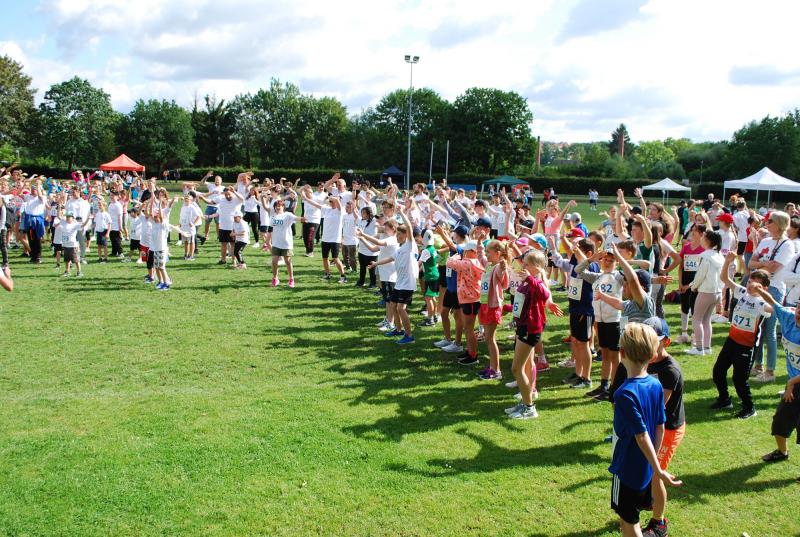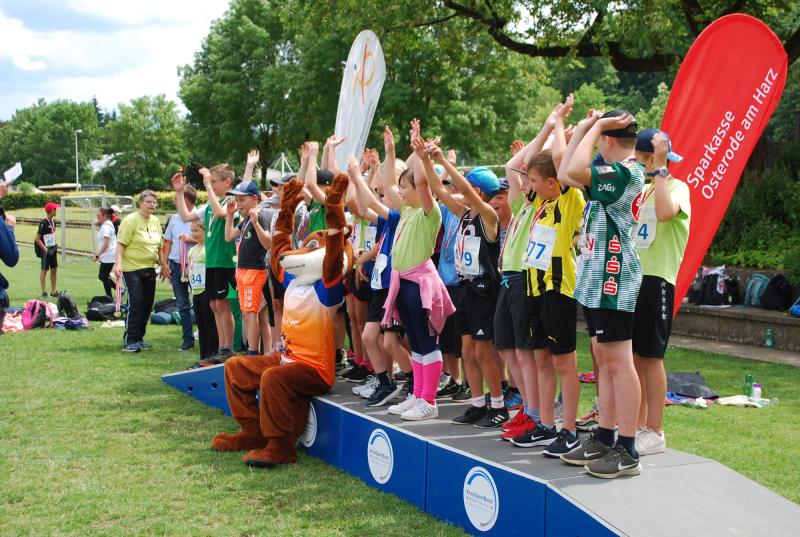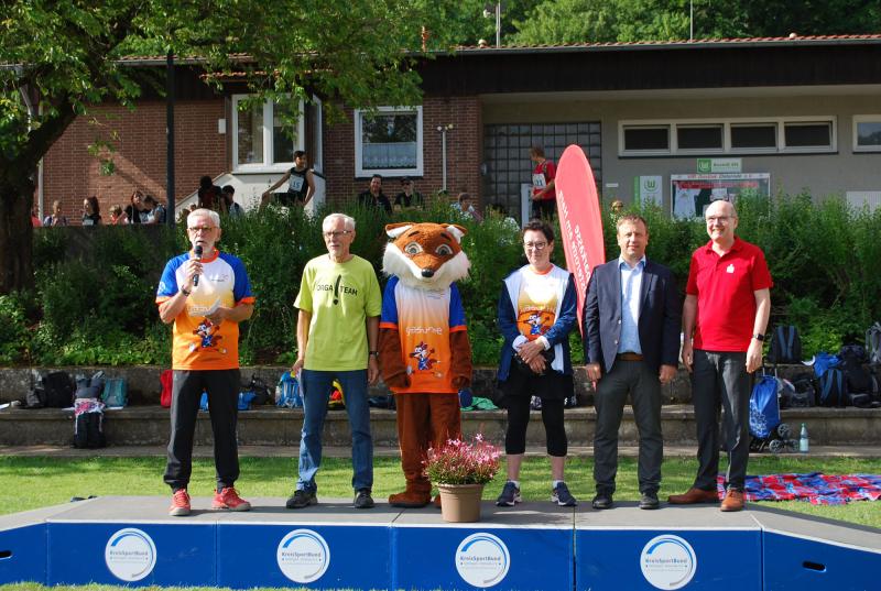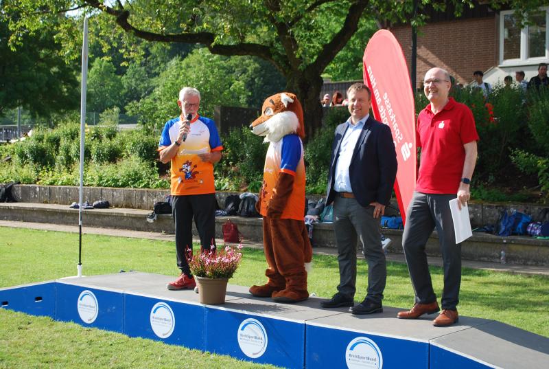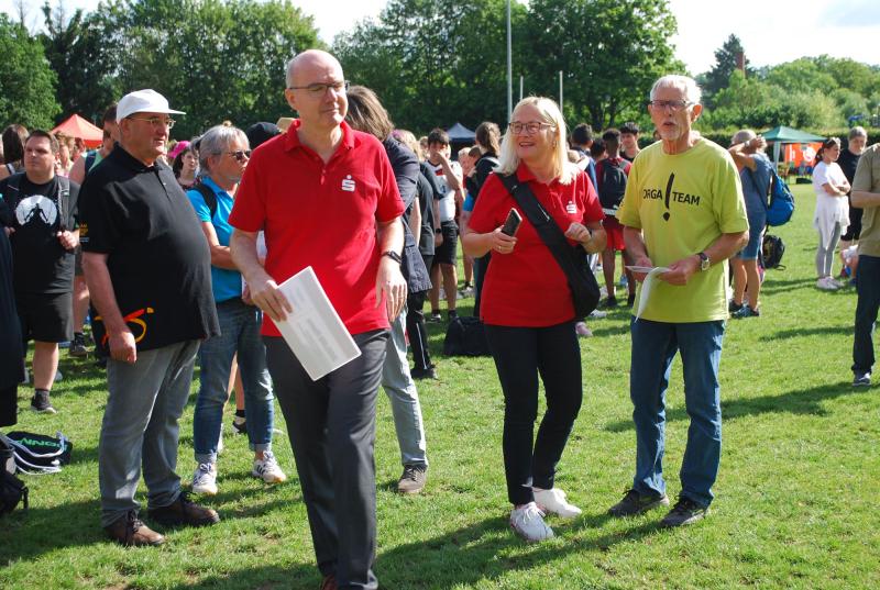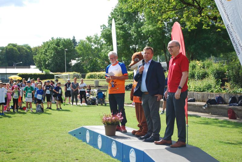 Es war alles bestens vorbereitet im Jahnstadion. Die Sportgeräte waren ausgeteilt, die Disziplinstandorte durch die Prüfer*innen besetzt, Spiel- und Bewegungsstationen aufgebaut. Und so konnte die Begrüßung durch Osterodes Bürgermeister Jens Augat pünktlich starten. Augat begrüßte die jungen Sportler*innen und alle Helfenden. „Im Sport geht es oft um Siege und Pokale, aber heute geht es um gemeinsamen Spaß an der Bewegung und wichtige Begegnungen zwischen Menschen mit und ohne Behinderung. Und so wünsche ich euch einen tollen Tag“, sagte der Bürgermeister. Und anschließend gab es Ehrungen und Überraschungen. Thomas Toebe, Vorstandsvorsitzender der Sparkasse Osterode am Harz überreichte Schecks für die Schulen, die beim Sportabzeichenwettbewerb vordere Platzierungen erreichten. Und Klaus Dreßler überraschte Renate Wagner mit einer Blumenschale und dankte ihr für den jahrelangen ehrenamtlichen Einsatz und ganz besonders für ihr tolles Engagement für den SPORTIVATIONSTAG.