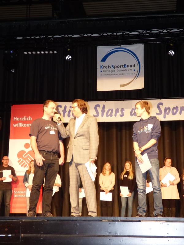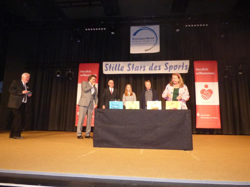 Für die tolle Arbeit der „Stillen Stars des Sports“ im Verein, bedankten sich die Laudatoren Bernhard Reuter (Landrat), Klaus Becker (Bürgermeister der Stadt Osterode am Harz), Lara Depre (Betreuerin der Stolle Freizeiten) und Thomas Toebe (Vorstandsvorsitzender der Sparkasse Osterode am Harz) auf Ihre ganz eigene, besondere Art und Weise.